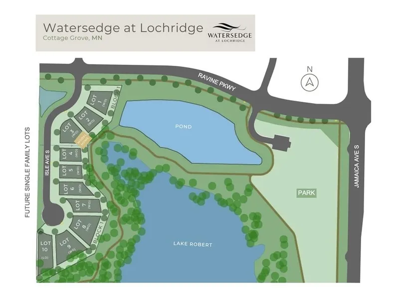 Watersedge in Lochridge is adjacent to Lake Robert, near Warner's Nature Center, parks, nature trails, and Mississippi River recreation areas, providing access to outdoor activities and scenic surroundings. Convenient access to Cottage Grove & Woodbury connects residents to shopping, dining, and regional amenities.