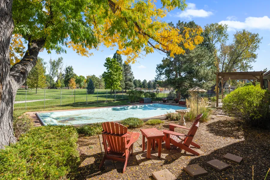 This lovely ranch home has true pride of ownership throughout, with the same owners for over 45 years. The home backs up to a large park and providing a special and unique sense of openness, privacy, and uninterrupted views space . The floor plan is designed for comfortable living & effortless entertaining, set on a generous corner lot. There is new paint and carpet up stairs. A Tesla solar roof enhances the home with modern efficiency owned with back up batteries. The main level offers a gracious flow, beginning with a formal living room anchored by a large picture window that fills the space with natural light. Enjoy the formal dining I living room next to the updated kitchen, perfect for both everyday living & hosting. The kitchen features abundant cabinetry, quartz countertops, and an eat-in space with direct access to the backyard. A spacious great room provides a comfortable gathering place centered around a wood-burning fireplace. The primary suite is truly impressive, offering a massive bedroom, has 2 closets including a walk-in closet, & a ¾ bath. Two additional bedrooms share a full hall bath, complemented by a convenient half bath & a dedicated laundry room, all on the main level. The partially finished basement adds space with a large flex area, a non-conforming bedroom with built-in bookcases and a Murphy bed, a ¾ bath, and a large storage and utility room—ideal for those who value workspace, organization, & flexibility. The backyard is open, expansive, with a pool, a patio with a pergola, backing to the park, and enhancing the sense of privacy and tranquility. The front of the home is equally welcoming, featuring a charming front patio & rose garden. Ideally located within walking distance to schools and parks, with easy access to shopping, dining, Highway 36, and I-70, this home offers quick connections to downtown Denver, Golden, and the foothills—bringing together space, sustainability, location, and livability in one exceptional Arvada setting.