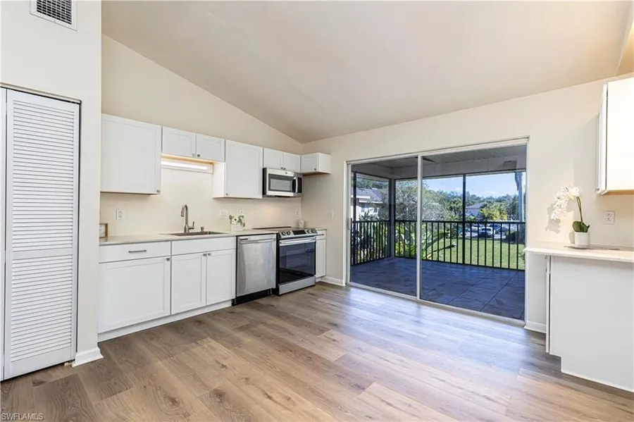 This spacious 2 bedroom and 2 bath condo unit located is on the second top floor and perfect for annual Florida living. Situated in a convenient Naples this beautiful condo with a high ceilings features a large eat-in kitchen with granite countertops and new stainless steel appliances. The laundry is conveniently located in a closet. Both bedrooms feature large closets, with the master closet being enhanced. There is also an exterior storage closet is available. The large lanai looks out over the private backyard, providing tranquility and relaxation. Just steps away from the community pool, this condo also includes 2 assigned parking spaces. It's just minutes from the beach and a short drive to restaurants, banks, the mall, recreation centers, less than 20 minutes to the beach.