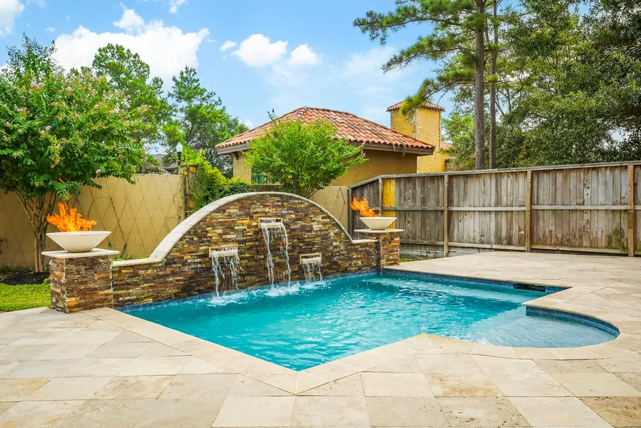Massive double doors open wide, extending a warm welcome into this stunning custom home. The floor plan flows from one beautiful space to the next. Rich wood flooring extends throughout most of the first level, complemented by high ceilings, expansive windows, and tall 8-foot solid wood doors that enhance this home. The main level features two spacious bedrooms and 2.5 bathrooms, along with a formal dining room, bright breakfast area, private study, and a cozy yet spacious family room. The gourmet kitchen is outfitted with granite countertops, double ovens, a wine bar with refrigerator, and space to entertain. Upstairs, enjoy movies in the game room located near two additional bedrooms and one full bath. Step outside for some backyard entertainment with a stacked-stone pool, outdoor kitchen, fireplace and fire pit, or catch the big game from the covered patio equipped with TV, perfect for any sports enthusiast. The three-bay tandem garage provides ample storage and parking.