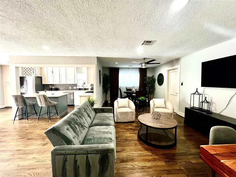 House remodeled mid-century modern home in a prime Houston location! Taken down to the studs and rebuilt with new roof 2025, new electric service box in 2025, double pane windows, beautiful oak hardwood floors throughout the house, new front door to be installed in the next 30 days, landscaping sets the tone for an open-concept living and dining area. The custom kitchen features shaker cabinets and an island with white marbles counters —perfect for entertainment, laundry room in the garage. The primary suite includes recess lighting and a spa-like bath with a large walk-in shower. Two secondary bedrooms are tucked away with a full bath nearby. Spacious backyard offers a plenty of room for a pool or custom outdoor retreat.