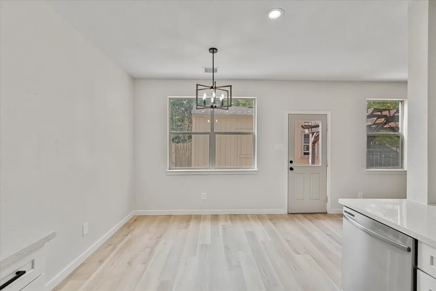 Welcome to this stunning Lennar home in a semi-cul-de-sac, offering ultimate privacy with no rear neighbors. This elegant two-story features 4/5 spacious bedrooms and 3.5 stylish bathrooms. A versatile media/game room can serve as a fifth bedroom. Sunlight fills the living area, enhanced by new chic light fixtures throughout and new luxury vinyl plank flooring. The gourmet kitchen is a chef’s dream with quartz countertops, an island, new stainless steel appliances, a gas range, new floors, and ample cabinetry. The serene primary bedroom includes new carpet flooring and an en suite with quartz counters. Additional features: PEX plumbing, two water heaters, two thermostats, Spectracide termite bait stations, and a new garage door and motor. Solar panels provide energy efficiency without leasing. The backyard includes a storage shed for additional storage/workshop. Located minutes from Vintage Park shopping, dining, and Meyer Park, this home is a true haven you won't want to miss.