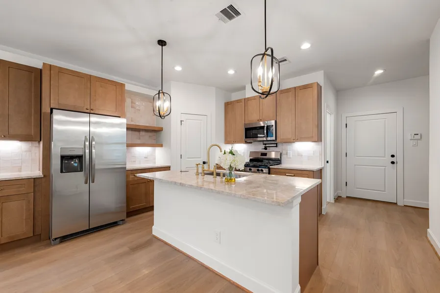 Welcome home to 882 Prosper Street, a modern two-story home offering open-concept living enhanced by elegant, timeless design elements throughout. The home features inviting living spaces anchored by fireplaces on both the main level and upstairs, creating warmth and architectural interest. A thoughtfully designed kitchen showcases a large island, warm wood cabinetry, stainless appliances, and seamless flow for entertaining. A unique, dedicated wine room adds a distinctive touch, perfect for showcasing and storing a curated collection. The primary suite serves as a private retreat, complete with a private balcony, walk-in closet, and a spa-inspired bath with double sinks, freestanding soaking tub, and a frameless shower. Additional bedrooms offer flexibility for guests, home office, or everyday living. Outside, enjoy a fully fenced backyard, private driveway, and attached two-car garage. Ideally located with convenient access to major roadways, shopping, dining, and Downtown Houston.
