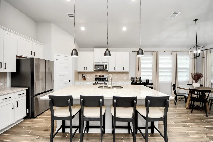 This stunning one-story K. Hovnanian Ashburn II model offers 3 bedrooms, 2 baths, and a 2-car garage with a thoughtfully designed open floor plan. The beautiful kitchen is the heart of the home, featuring gorgeous quartz countertops and seamless flow into the living and dining areas—perfect for everyday living and entertaining. The spacious primary suite boasts a huge walk-in closet, dual sinks, and a separate soaking tub and shower. Enjoy outdoor living under the covered backyard patio with no back neighbors, providing added privacy and tranquility. Don’t miss this exceptional home!