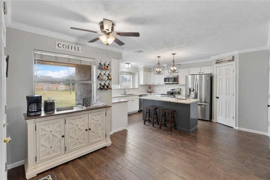 Classic brick residence nestled on over half an acre in the highly sought-after Plantation Subdivision. Thoughtfully designed for both comfort and entertaining, this home features a spacious, open layout, granite countertops throughout, and timeless finishes filled with natural light. Living area is warm and inviting, highlighted by a stunning fireplace that serves as the focal point of the space. Kitchen features a center island with prep sink, ample cabinetry, and generous workspace—ideal for both everyday living and entertaining. Step outside to the covered back patio, conveniently accessible from the main living area. An added luxury is direct access from the primary bedroom, allowing you to step onto the patio and enjoy quiet mornings or peaceful evenings. Residents enjoy exclusive community amenities including a private boat ramp, lighted pier, and a brand-new community park; offer...