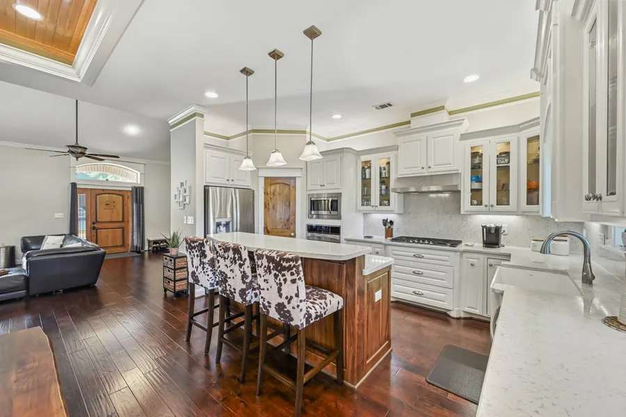 Truly one-of-a-kind, this custom-built 1-story home sits on almost half an acre in Old Katy. No HOA, & No MUD taxes. The Family Room features a vaulted ceiling, hardwood floors, crown molding, & an open flow to the Kitchen & Dining Room, creating a bright, welcoming space. The Chef’s Kitchen impresses with quartz countertops, a farmhouse sink, custom glass-front cabinets, & breakfast bar, while the Dining Room boasts a stunning wood-inlay ceiling. A versatile Home Office offers privacy & functionality or used as the 4th bedroom. The Primary Suite features a vaulted ceiling, crown molding, & French Doors opening to an oversized covered patio plus an en-suite Bath offering dual vanities, walk-in dual shower head glass shower, marble floor & a spacious walk-in closet with an abundance of built-ins. Enjoy the peaceful backyard with mature shade trees, a storage building, sprinkler system, o...