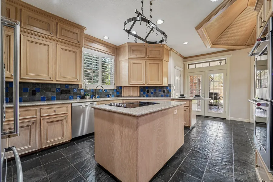 This beautiful Bay Oaks home offers timeless design and thoughtful function across 3,478 square feet. The two-story home features four generously sized bedrooms and three-and-a-half baths, with the primary suite conveniently located on the first floor. Formal living and formal dining rooms provide elegant spaces for entertaining, while a classic butler’s pantry connects seamlessly to the heart of the home. A private study with a built-in desk is ideal for work. Upstairs bedrooms offer ample space and privacy, perfect for family or guests. With no rear neighbors, the home opens directly to a park and tennis courts, creating a rare sense of openness and tranquility. Mature trees and lush landscaping frame the backyard beautifully, while the extended covered patio invites relaxed outdoor living year-round. The garage includes built-in cabinets and storage. Altogether, this home blends traditional elegance, practical design, and an enviable setting in one exceptional offering.