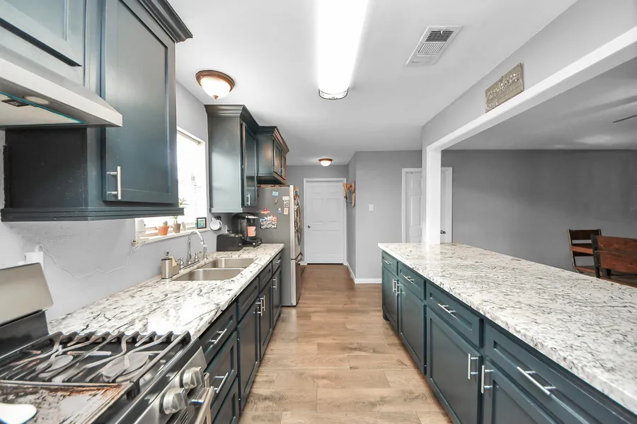 Updated 3-bedroom, 2-bath home featuring tile floors throughout, custom cabinets, quartz countertops, and a large kitchen island perfect for cooking and entertaining. Enjoy peace of mind with a brand-new 30-year roof with warranty. The property offers a large front porch, detached garage, and an oversized 7-car driveway — plenty of space for guests and gatherings. Move-in ready and full of charm!