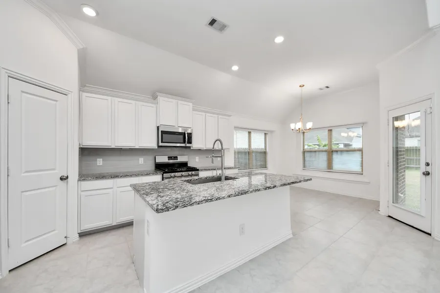 Welcome to this beautifully maintained next-generation home offering flexible family living! This home boasts a spacious living room with soaring ceilings and a cozy corner fireplace. The modern kitchen features an island with bar seating and flows seamlessly into the dining and living areas, perfect for entertaining. A next-gen suite with a kitchenette on the first floor adds versatility, while the primary bedroom offers an en-suite bath with dual sinks, a soaking tub, a walk-in shower, and a large walk-in closet. An additional first-floor bedroom and full bath provides convenience and comfort. Upstairs, enjoy a loft space and an additional bedroom and full bathroom, offering ample space for various needs. The fully fenced backyard features a covered patio and plenty of green space for outdoor enjoyment. This home is close to local shopping, dining, parks, easy access to major roadways, combining comfort, functionality, and a prime location.