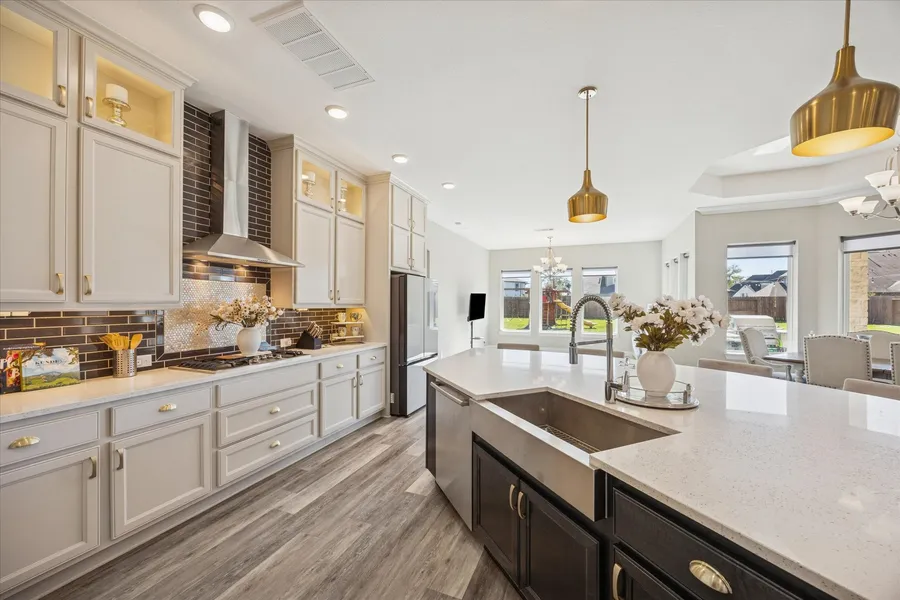Stepping into luxury as your life unfolds at 19519 Hickory Heights Drive. As you drive up you are greeted by a beautiful circular driveway with eye catching landscape. As you cross the the threshold of your dream home you enter a large entrance way with an open concept for family living and entertainment. The kitchen serves as the focal point of the home, equipped with custom kitchen, cooktop, flowing seamlessly into the living area high ceilings. Walls of windows frame views of the large backyard with a warm fireplace centering the view. The home features a study for those working from home. A key feature is one floor living with all bedrooms on the same floor. Hospitality is perfected by the outdoor kitchen and large covered patio. Add to this a three car garage and gated community and all this adds up to the ideal texas home.