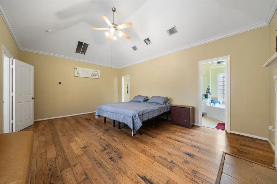 Incredible & spacious single-story home on a 0.48 acre cul-de-sac lot with a shaded front porch, ample driveway space, & no back neighbor for added privacy! Inside, you'll find high ceilings, all solid flooring, crown molding, ceiling fans throughout, bay windows, a formal dining, French door study, living room with a fireplace, oversized utility room, breakfast area, & kitchen with a cooktop island, granite, breakfast bar, under cabinet lighting, lots of storage space, & a walk-in pantry. The large primary suite includes a walk-in closet, dual vanities, soaking tub, & separate shower while the back of the home offers a detached garage converted to a bonus room with a window unit - perfect as a guest room, game room, workshop, home gym, etc! Enjoy outdoor entertaining with an enclosed covered patio, huge wood deck, & plenty of fenced backyard space! Easy access to TX-99, TX-146, TX-330, & Roseland Park which offers boat ramps, sports courts, a playground, picnic area, & more! NO HOA!