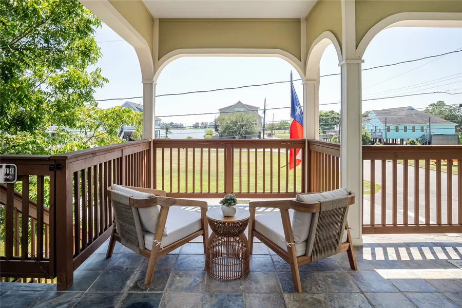 Discover the charm of this stunning Waterview Custom Home located just steps from Galveston Bay. Boasting 4 bedrooms & 3.5 baths, this residence features picturesque windows framing captivating views. The open kitchen is a cook's dream with quartz countertops, and stainless appliances. Also, enjoy a separate glass-doored liquor room that provides luxury space for all your liquor storage & ease of entertaining! An open office area at the top of the stairs offers serene work-from-home space with spacious water views. The primary bath includes a walk-in shower, a large tub, & walk-in closet. Enjoy the special outdoor spaces w wrap-around porches, a sparkling custom pool w 3 built-in fire bowls of abundant lava rock, sapphire fire glass, & a relaxing jacuzzi tub. The lovely outdoor living area also features a bar, outdoor kitchen, fire pit & a fenced private yard. The garage has a stunning, clean, epoxy floor ready for all your storage here. Don't miss this one... schedule to see it today!