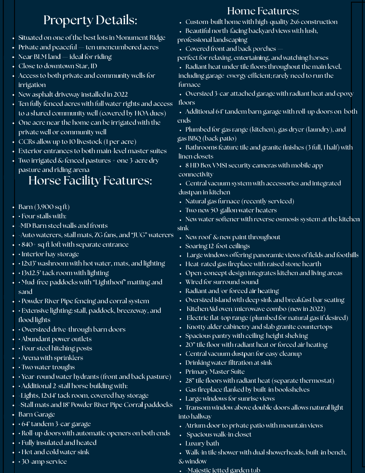 3,431 sq ft custom home offers 4 bedrooms, 3.5 baths-including dual main level master suites-and an open, light-filled layout with radiant heated tile floors throughout the main level and attached oversized 3-car garage. Soaring ceilings and stunning views of the surrounding foothills. Featuring a gourmet kitchen, formal dining, grand room with gas fireplace, and covered patios. Equestrian amenities include irrigated pastures, a professionally designed riding arena, and a brand-new 3,900 sq ft barn with mud-free paddocks, tack room and hot/ cold water wash room, hay storage, and an 890 sq ft loft. The 64' heated barn garage includes