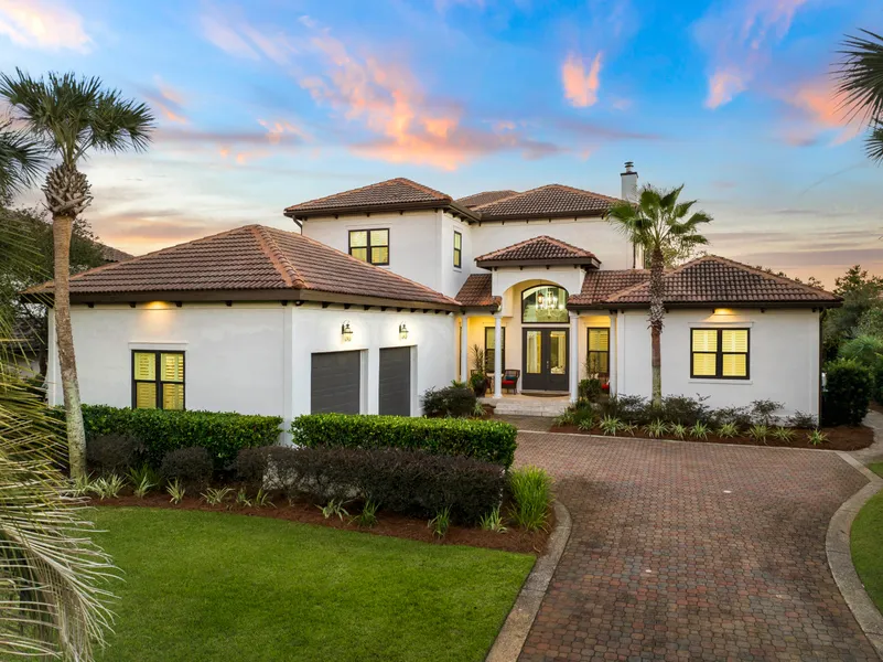 Superbly located to enjoy the 30A lifestyle, this beautiful Mediterranean-style stucco home is situated in Bella Mar at Gulf Place. Surrounded by lush palm trees, it makes a grand architectural statement. Available fully furnished with a few exceptions, the home has recently been updated with more than a half-million in improvements. A pavered driveway sweeps up to a two-car garage and a portico-ed entrance announces your arrival. The home has ample living space with a reverse floor plan and bedrooms on the first floor. A third-floor open porch/lookout has an outdoor swaying bed seat for enjoying stunning sunsets and far-reaching views. Gulf glimpses can be seen above the rooftops. Two additional covered porches complement the artfully designed terrace surrounding the lagoon pool. Mature, oversized landscaping and a tinkling water feature make this a private paradise for entertaining and relaxing. Inside, this luxuriously appointed home is light and bright, with a 24-foot high foyer leading into an open living space. Clerestory windows flood the space with natural daylight without compromising privacy. White Dominican shell stone flooring enhances the clean, contemporary vibe, while a custom wood-burning fireplace provides warmth on cooler evenings. The home is perfect for entertaining with a custom-designed wet bar with backlit accents. It incorporates a beverage refrigerator, sink and display shelving. A dedicated office space with direct access leads to the stunning pool area. Four beds and 4.5 baths include a lavish first-floor primary suite that deserves special mention. The bedroom boasts hardwood flooring and a cozy sitting area. An archway leads through the custom-built dressing area to a spa-like bathroom with two vanities, an elegant soaking tub and an oversized, glass-enclosed shower. Three ensuite bedrooms and a generous laundry room complete the ground floor. The second floor accommodates a generous family room with hardwood flooring moving into the dining room. The adjoining chef’s kitchen has double stainless steel ovens, a white marble backsplash and a spacious granite-topped island with seating. Doors open onto the covered balcony, with views of the heated saltwater pool, lighting, and a water cascade. The outdoor kitchen is a further delight for those who love to entertain. A gazebo with couches and a retractable sunscreen provide shade areas as you dine and socialize on the stunning travertine terrace. New hurricane-rated windows and a whole-home generator add peace of mind. Private deeded beach access is a short stroll or golf cart ride away, along with a good choice of restaurants, cafes and boutiques at Gulf Place. Bella Mar is across from Vue on 30A and Santa Rosa Golf & Beach Club.