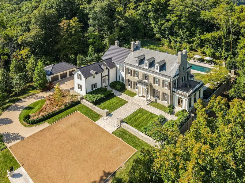 Welcome to Littlefawn. Tucked on a quiet country Road only 3 miles from the charming village of Leipers Fork and a ten minute drive into downtown Franklin. Here is where you will enjoy the finest in country living. The Farm displays true elegance starting at the iron electric gate with a manicured and paved driveway (just shy of 1 mile in length). The drive winds past a creek, a pond and through the farm to both a 2845 sqft guest house/timber frame horse barn, and up to the main house on a commanding perch on top of one of the highest peaks in the area at 870 feet elevation. The farm overlooks large acreage properties including Beechwood Hall. The land is comprised of rolling meadow, level pasture, and forested areas both hilltop and Creekside. Enjoy picnics and fishing for smallmouth bass, bluegill and black crappie on your 1500' shoreline of the Murfrees Fork of the South Harpeth River. The fertile level land is perfect for food plots or cultivation, and long enough to accommodate a 3,200 foot runway. The farm is fenced for livestock and has multiple creeks and ponds.The hand cut stone and wood siding home is 100% detail accurate Georgian era style with 20th century, lifetime durable finishes - engineered hardwood flooring, geothermal heating and cooling, poured, reinforced concrete below grade walls, low voltage lighting in antique fixtures, an elevator to all levels, indoor sprinkler systems with a dry hydrant that pulls from the 30,000 gallon swimming pool, underground utilities and modern appliances.The 3 bed/2.5 bath guest house adds a splash of modern to the surrounding historic landscape with its 24 foot vaulted ceiling living area and 4- story glass stair tower. The guest house connects to the 4-stall timber frame horse barn through the underground laundry room beneath the porte cochere. A little ways down from the barn complex you will find 2 equipment/hay/shavings out buildings (similiar in construction & paint color as guest house) and a chicken coop and wired goat pasture area. In between the main and guest houses is one of the familys favorite spots - straight out of a novel, an imposing oak tree with two rope swings