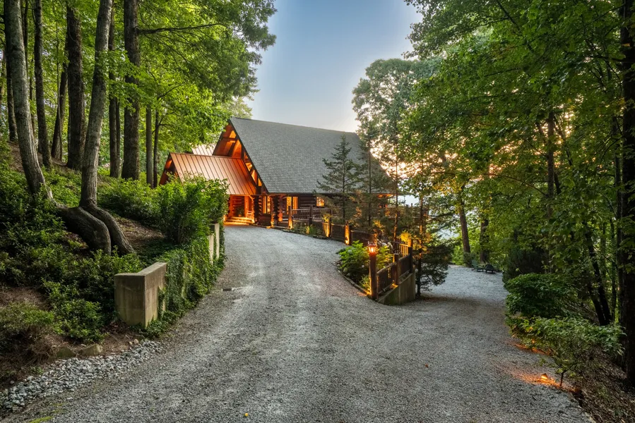 Perched on Charlie Mountain with breathtaking sunset views overlooking Lake Burton and surrounded by the serenity of the Blue Ridge Mountains, this luxury custom log home blends timeless craftsmanship with modern comfort and an ever changing visual landscape. Built from authentic hand-hewn logs, the home showcases vaulted ceilings, pine floors, and a masonry stone fireplace that anchors the open-concept great room. Expansive windows frame stunning westward-facing views over Lake Burton, offering long range views that become the backdrop of your daily life. The gourmet kitchen is perfectly positioned for entertaining, with warm custom mission-style cabinetry, premium appliances, and a seamless flow to the dining and outdoor living areas. Whether hosting friends and family on the expansive deck enjoying the views or savoring a quiet morning with coffee or tea under the protected cover of t...