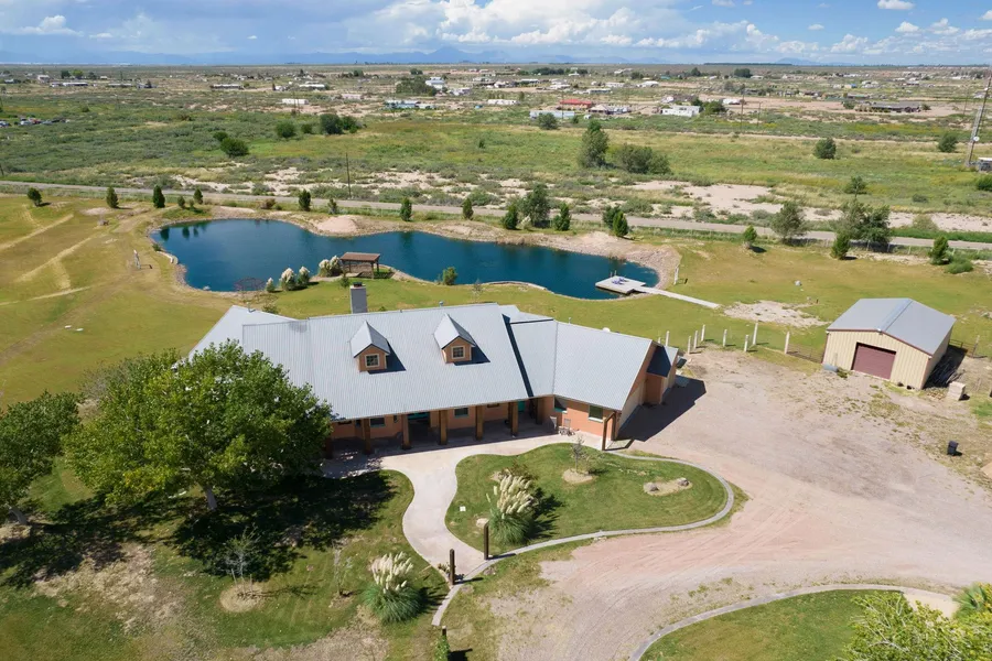 Luxury estate with a private pond located in Alamogordo, NM. This pristine property features a 3,795 square foot home with a 3 car garage, a detached 32 x 40 shop, and an area for shooting sports. The serene pond is a dream for any home owner. It has a dock to relax and enjoy the sunsets on and is filled with crappie, hybrid bluegill, koi, goldfish, and fantails. The wildlife includes great herron, mallards, canadian geese, red winged black bird, and bull frogs. The spacious porperty is 5.6 acres with breathtaking veiws. The home has 4 bedrooms, 4 bathrooms, great room with a grand fireplace, surround sound, vaulted ceilings, and a chefs kitchen with double ovens. The master suite has a large bedroom, oversized walk in shower, walk in closet, and a private patio perfect for enjoying the sunrises. 2 additional parcels are available for the buyer to purchase. Horses allowed. Call today to schudule you private showing!