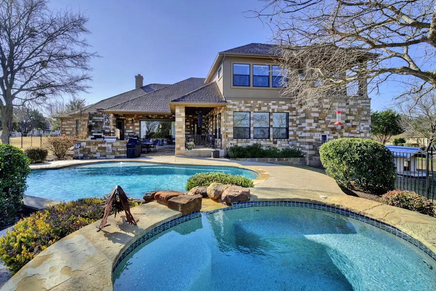 Beautiful Jimmy Jacobs home in a great neighborhood. The one acre plus lot provides plenty of elbow room and upgrades. Fantastic kitchen and living area are made for entertaining. There is a formal dining area, office, game room, and bonus room with pet door. The upstairs guest bedroom has a full bath, balcony, and sound abatement features. Other amenities include power shades, stone accent walls, foam insulation, tankless water heaters, water softener and hickory wood floors. Out the back door is a welcoming covered porch, a great patio with an outdoor fireplace, outdoor kitchen, a pool, and spa with a waterfall. The side yard is fenced off from the pool area. There is a nice 3-car garage and circular drive. You must see this Luxury Home to appreciate its beauty.