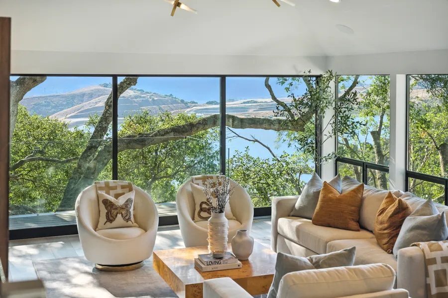 This modernist retreat, rebuilt from the studs in 2019, is privately tucked along a quiet lane just a mile from top-rated Sleepy Hollow School. Designed for architectural distinction and a seamless connection to nature, the home captures sweeping views of Briones and the surrounding hills. Mature trees and manicured gardens frame a grassy play area, creating an idyllic outdoor setting.