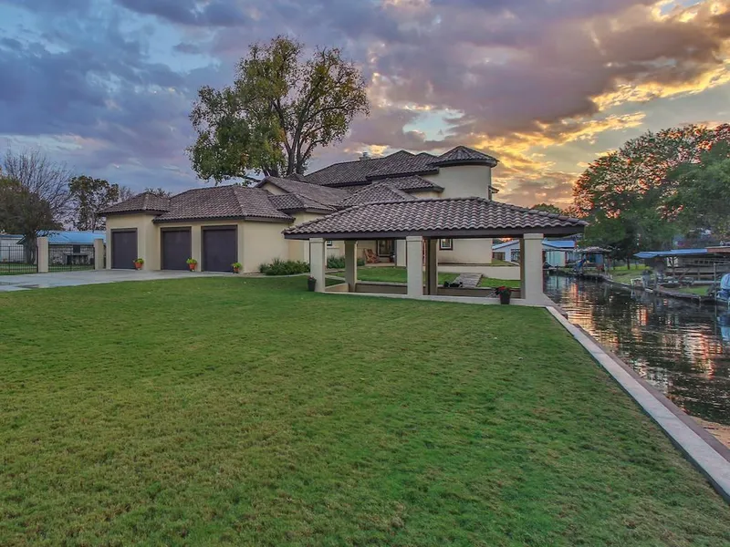 This 6,899 sq ft executive retreat on the shores of Lake LBJ is located on a large cove providing spectacular views of the wide open lake & stunning skies. The boat house is on its own private canal that runs alongside the home.