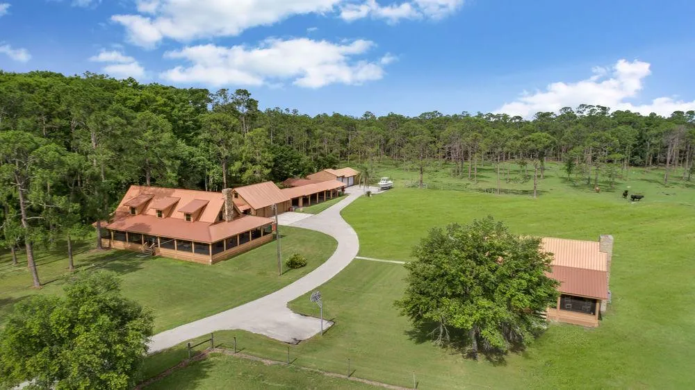ELEGANT - EXCLUSIVE - EXQUISITE! ENJOY YOUR NEW LIFE IN THE COUNTRY WITH THIS LUXURIOUS YET RUSTIC LOG CABIN RANCH ON 47.73 ACRES IN THE BEAUTIFUL RURAL MUSE AREA OF LABELLE, FLORIDA ---- centrally located only 45 minutes from Fort Myers or 1 hour 15 minutes from Naples! Perfect for a personal or corporate retreat or a family compound where memories are made! Property is primarily improved pasture land with some scenic wooded areas for wildlife. Highly picturesque log cabins make this ranch truly exceptional with brand new regal copper roofs including breezeway, multiple garage and bay areas, plus stalls & cages for horses and other animals. The 2 story main lodge is a 3 BR, 3.5 BA with "sit-a-spell" wraparound porch on 3 sides, along with other features including a stone wood-burning fireplace. The matching guest house is 1,372 sq ft including a cathedral ceiling living room with brick ...