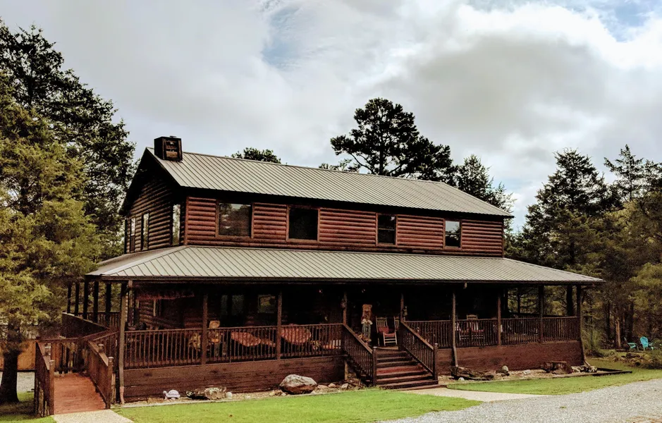 Stunningly beautiful 4 bedroom, 3 bath log siding home/cabin that is currently a vacation rental. The home/cabin has top-of-the-line amenities like granite countertops; gorgeous native species bar, mantle, beams, and woodwork throughout; Jacuzzi tubs, large walk-in shower; outdoor hot tub; extra-large wrap around porch with multiple seating areas; and an upstairs balcony with incredible views of the Winding Stair Mountains. The master on-suite features a seating area in the bedroom, huge walk-in closet, and master bath with custom shower, double vanity, and Jacuzzi tub. Above the open floor plan great room is a loft large enough for a sectional couch, TV, and even a pool table! The upstairs bedrooms are large and each has double walk-in closets. They share a bathroom with 2 vanities and a Jacuzzi tub/shower combo. Under the cabin is a 2 car garage and apartment with a kitchenette, full b...