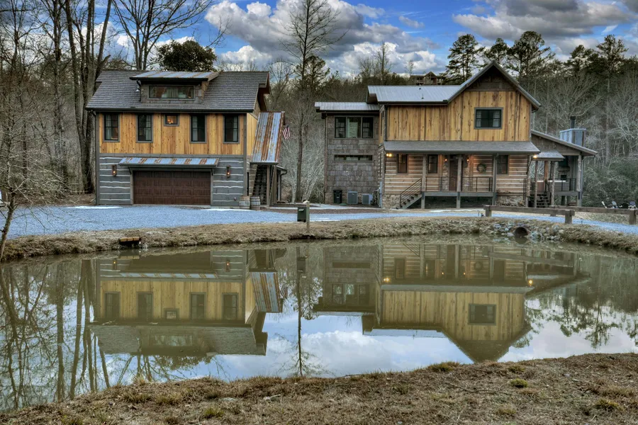 Welcome to the Toccoa Tailwater Fish Camp, a newly built 2024 lodge-style retreat offering over 300 feet of private Toccoa River frontage with a stocked pond on six acres. This one-of-a-kind property combines rustic craftsmanship with luxury finishes, designed for the ultimate fly-fishing and mountain lifestyle experience. The main lodge features four bedrooms, three and a half baths, with three bedrooms facing the river, each with its own electric fireplace. Vaulted ceilings, cedar beams, chink-style siding, and designer fixtures enhance the warm lodge feel. Expansive windows frame river views while the chef’s kitchen boasts granite countertops, custom cabinetry, and high-end appliances. The spacious party porch with a stone fireplace creates the perfect place to entertain while overlooking the river’s natural rock shoals and waterfalls. The guest house, located above the two-car garage, provides a private retreat with a living room, kitchen, two bedrooms joined by a bath, plus a loft for extra sleeping. A cozy covered porch with its own fireplace also faces the river, offering privacy and charm. Below, the custom speakeasy room is ideal for cocktails, games, or gatherings. Outdoors, a private stocked pond in the front yard is perfect for practicing your cast, while stone steps lead directly into the river to reach prime fishing holes. The gated entrance welcomes you into this fisherman’s paradise, complete with thoughtful touches, true cedar log beams, and lodge-style details throughout. An additional buildable lot is included, featuring a 2-bedroom septic and power already in place—ideal for expansion or investment. Whether you’re a serious angler, nature enthusiast, or seeking a luxury mountain escape, this property delivers an unmatched opportunity to own your private lodge on the Toccoa River.