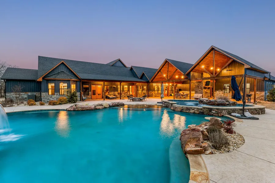 Completed in 2023, this expansive 7,265-square-foot single-story residence combines sleek modern design with classic ranch-style architecture. The homes exterior is clad in natural stone and wood siding, exuding rustic elegance, while the interior features soaring ceilings, custom finishes, and an open floor plan that enhances the sense of space. Large, panoramic windows throughout the home invite natural light and showcase breathtaking views of the property's rolling hills and pastures.