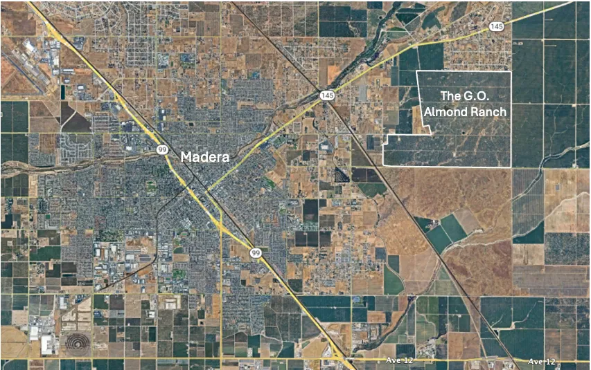 The G.O. Madera Almond Ranch consists of approximately 1,525 acres in Madera County, California, across nine legal parcels. All parcels are enrolled in the Williamson Act, and wetlands and swales were delineated prior to orchard development. Roughly 1,360 acres are planted to almonds. Of these, 948 acres were planted in 2009 and 412 acres in 2013. The orchard is comprised of Nonpareil (50%), Monterey (25%), and Fritz (25%) varieties on Nemaguard rootstock, with tree spacing at 18 feet by 20 feet (121 trees per acre).