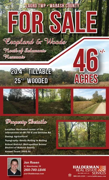 Legal Description: 46.21 acres, more or less, located in part of the E 1/2 of the SW 1/4 of S32, T28N, R8E, Lagro Twp, Wabash County, State of Indiana.