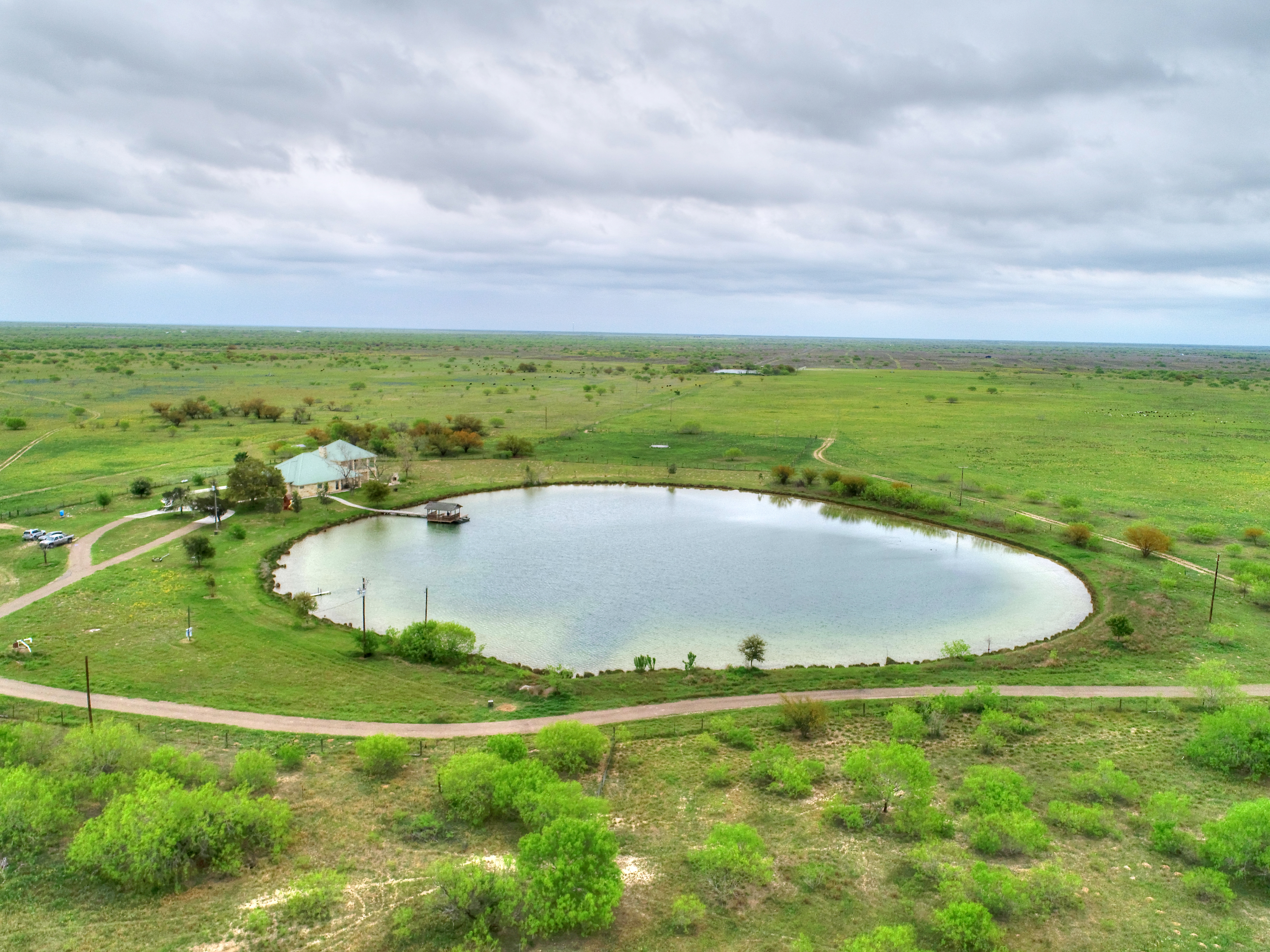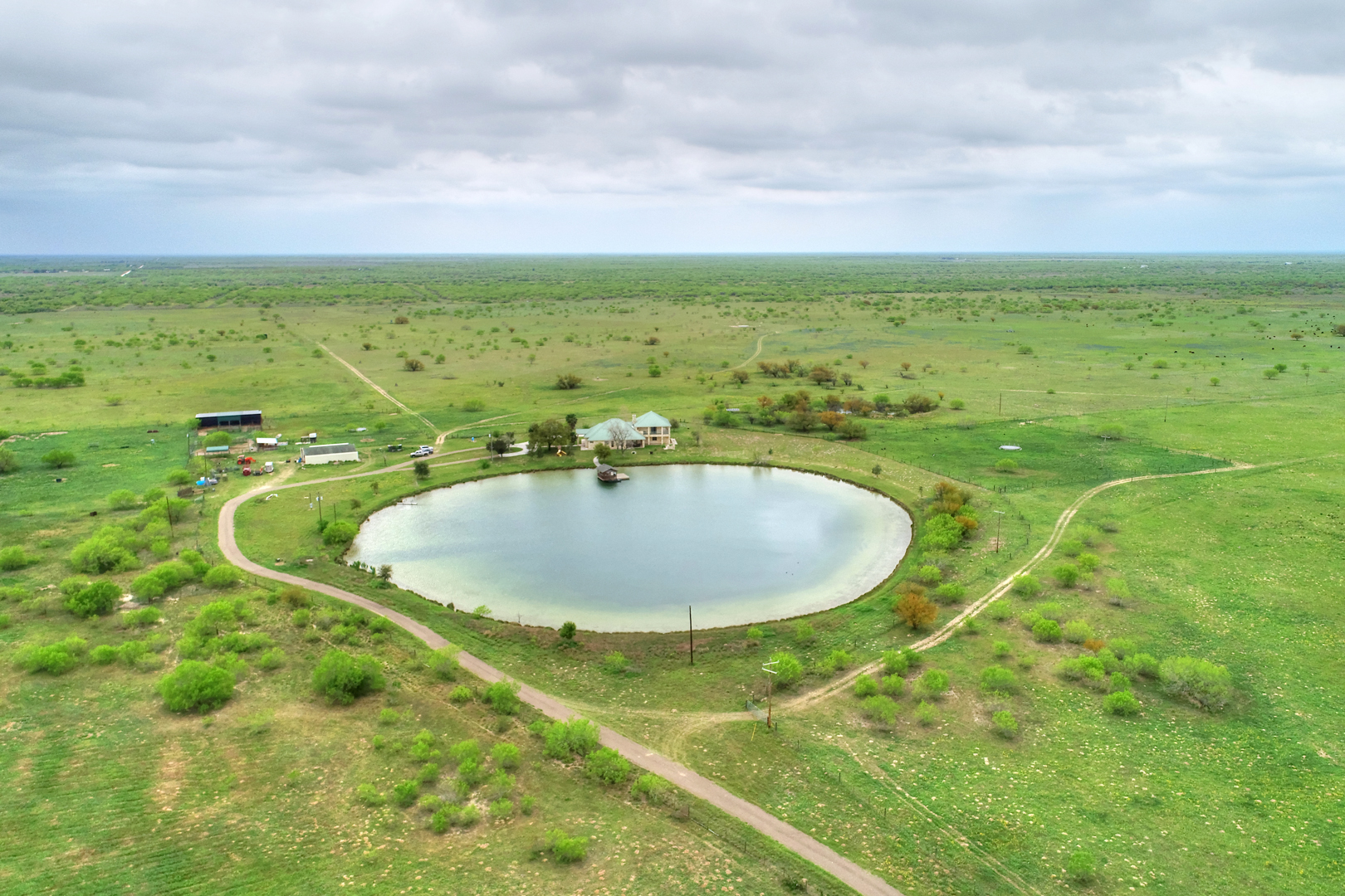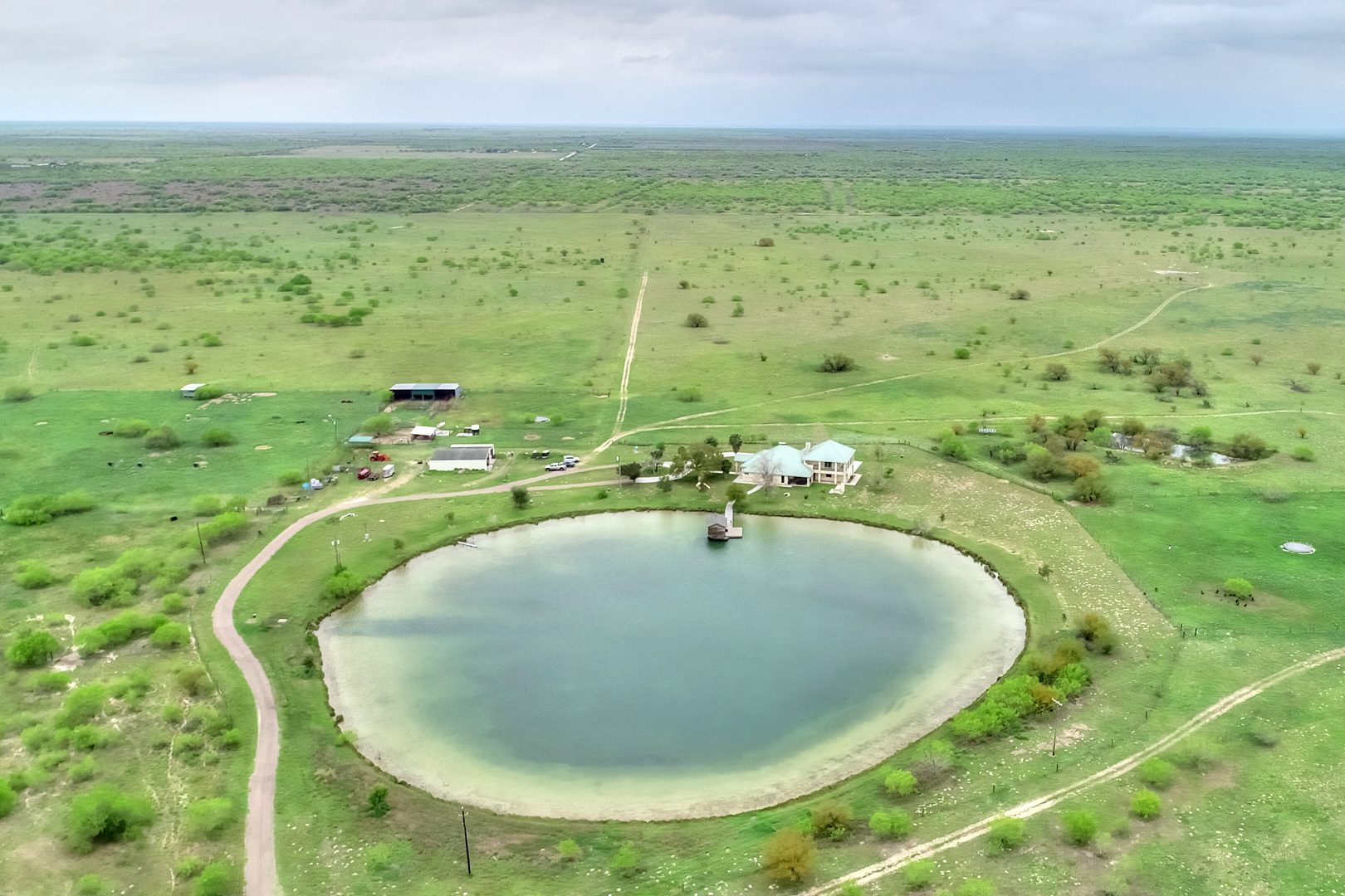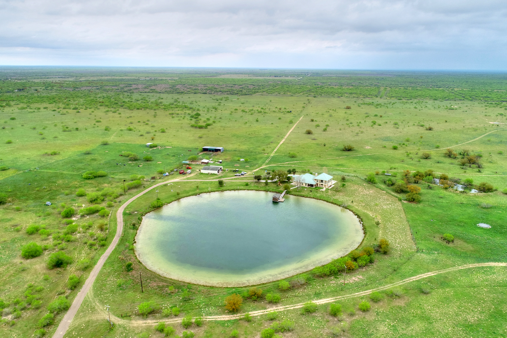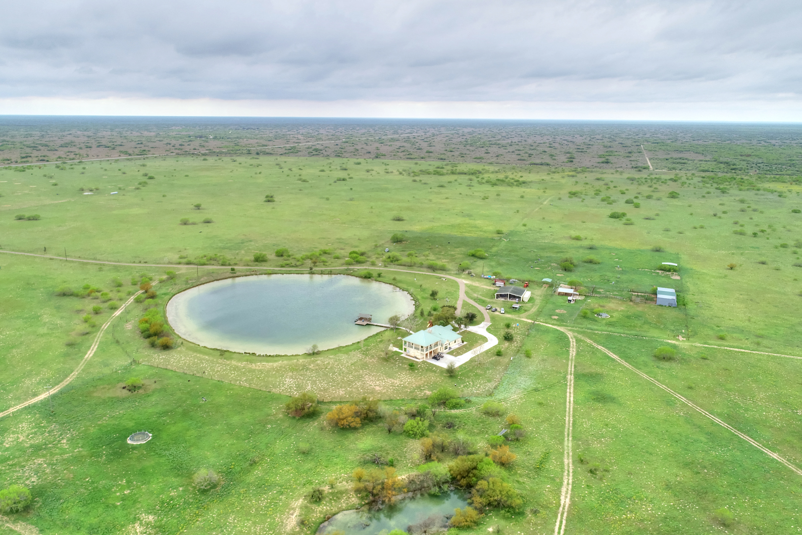 PRIVATE WATERFRONT COMPOUND ON 1000 ACRES WITH ALL THE EXTRAS. This sophisticated ranch home was built to last using Austin stone and 100-year aluminum roof. Inside, the crafted arched double doors welcome you to soaring ceilings, intricate wood detailing, expansive kitchen with Granite counter tops and great prep island make this home the family gathering place. 5 bedrooms, separate and spacious master with outdoor access, and 4 full bathrooms for all your friends and family to come for weekend memories. Incredible wood beams and floor-to-ceiling gas fireplace accentuate the countrified chic, open and airy home full of natural light and intoxicating sunsets. With several storage sheds on the property and even a three car garage, you're sure to have plenty of room for all your ranching equipment and toys. The opportunities with this land are endless. Fish in your very own pond, then relax around the bonfire at night's end. You will not find a more custom, comfortable, and enviable exclusive residence to call your very own. Quail,turkey and white tail are abundant with plenty of natural cover. Ranch is surrounded by other large ranches. There are two central pivots on the property with three wells and plenty of water rights to irrigate. there is also a three bed room two bathroom foreman's house located close to the front gate.