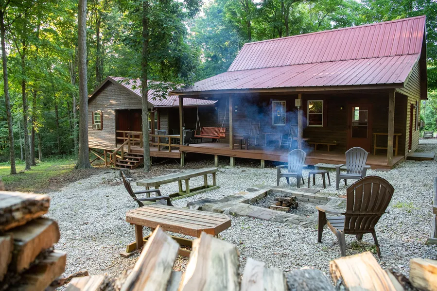 Nestled in the hills and hollows of Southern Indiana’s Hoosier National Forest, you’ll find this award-winning managed timber property that offers an incredible investment opportunity and unparalleled seclusion and tranquility while being perfectly situated to take advantage of the area’s many attractions. Located behind a gated entry and over ½ mile within the property, this secure hilltop retreat features a fully functional, well-built 1200sq ft cabin was finished with lumber harvested from the grounds. Three additional bunkhouses, built in 2015, are connected with a great outdoor covered dining area and a large covered porch complete with swings and rockers. A massive sunken fire pit with plenty of seating serves as the perfect evening gathering spot for friends and visitors. Additional storage is provided by an equipment shed, lean too, and utility shed. The current owners use this p...