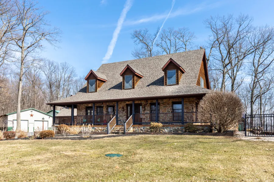 New Price. Discover your own private oasis with this stunning Cape Cod home, featuring elegant stone and cedar siding. As you arrive, a sense of tranquility will wash over you. Nestled in a peaceful setting, you can unwind on the covered front and side porches or step into the serene backyard, A spacious deck and patio offer a stunning view of the serene saltwater inground pool and a stocked pond, beautifully illuminated with LED lighting for a mesmerizing evening display. Inside, this beautiful four-bedroom home offers a bright and airy sunroom, along with a main-level master suite for ultimate convenience. Quality Anderson windows, woodburning fireplace enhances the perfect location to enjoy a quiet evening in the one of three entertaining areas within the main home. Within the upper level there are three bedrooms which include great views too. Need more extra space? The detached in-la...