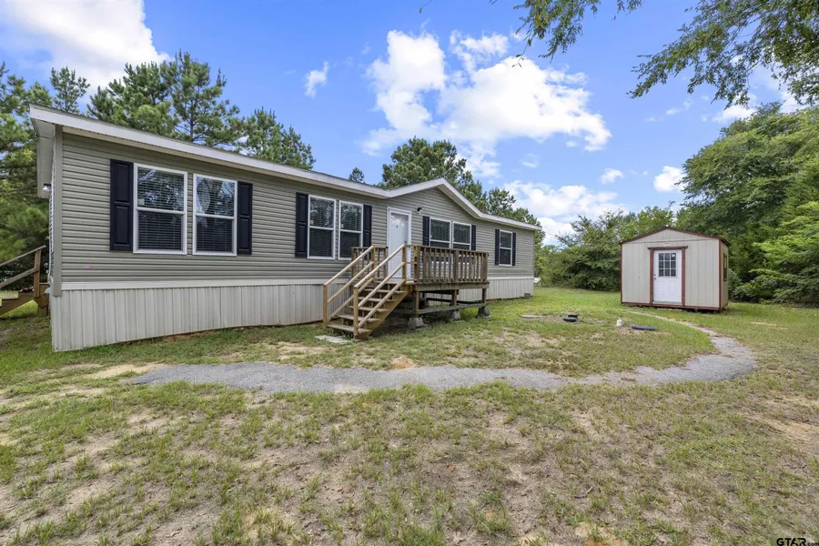 This home is so peaceful at the end of a quiet cul-de-sac in Jack, Three Lakes and Tyler Legacy school district! This charming 3-bedroom, 2-bathroom manufactured home sits on half an acre of land surrounded by beautiful soaring trees. As you step inside, you'll be greeted by an open living area featuring an electric fireplace and built ins, perfect for relaxing or entertaining guests. The kitchen is open concept to the living area with ample counter space and a spacious dining area in addition to the island seating, with a lot of natural light. The primary bedroom features an en-suite bathroom on the opposite side of the living room from the other two bedrooms. New floors installed throughout the living area. Outside, you'll find a storage shed, as well as a carpart for easy covered access to the home as well as a detached garage/workshop! With it's move-in ready condition, this home is ready for you to make it your own.
