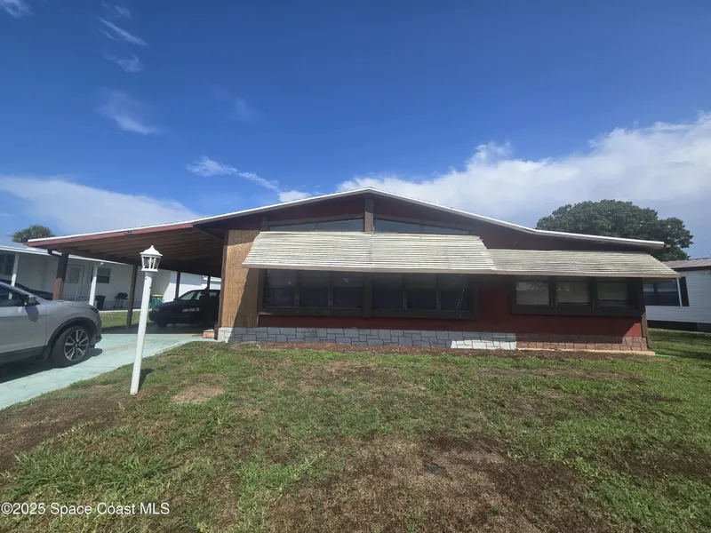 Partially renovated home is ready for handy owners or landlord. NEW 2024 ROOF. Owner has replaced the electrical outlets and subflooring, and has installed modern lighting. Interior has been neatly repainted including trim. Needs cosmetic rehab, including finishing flooring, replacing kitchen and one bathroom. Shower Durarock is already in and plumbing is done. Home has vaulted ceilings, a large enclosed porch, wood-burning fireplace, large carport, workshop/storage shed, and exterior laundry room. Barefoot Bay is a deed-restricted manufactured home community offering golf, a restaurant and sports bar, activities, multiple pools, beach access, a private fishing pier, and nearby shopping and restaurants. HOA fees are low and included on the annual property appraiser taxes