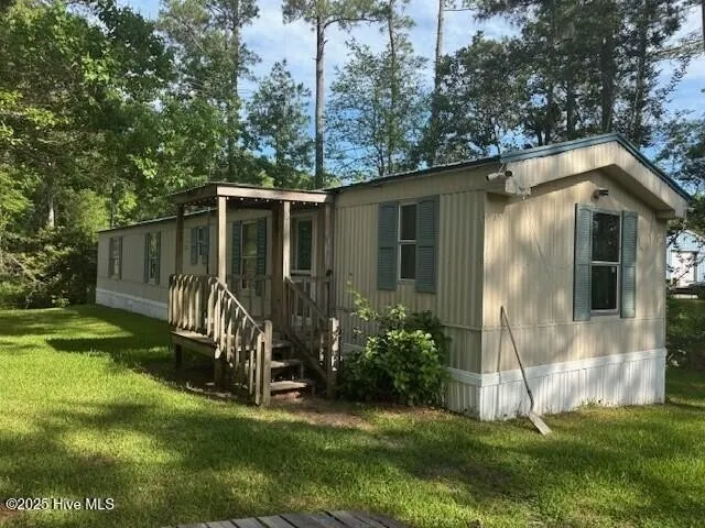 Ready for your peaceful place? Check out this charming 1989 manufactured home nestled in Hampstead on almost a half-acre. This home offers comfortable living space with 2 bedrooms, 2 full baths, open kitchen/dining area and an 18' x 12' addition. New flooring and paint throughout. The AC unit was installed less than 4 years ago along with a mini split in the addition. Water heater was installed about three years ago. There are W/D hookups and a 4-camera security system installed. This cozy home is near the end of a dead-end road (less traffic noise) with lots of trees for shade and privacy. Covered front porch and covered back deck with small fenced in yard for those fur babies. There's an 8' x 12' outbuilding with two entrances and ramps. This property also benefits from being close to shops, restaurants, convenience stores and the new school that's being built on 210. Don't miss out on this fantastic opportunity to own a piece of Hampstead and create lasting memories.