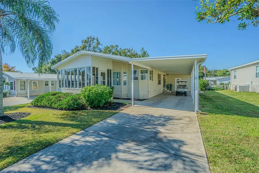FURNISHED & Turn-key, GATED Grand Horizons home on exterior lot... barely used, meticulously maintained and ready for YOU! Enter from your covered carport into a Vaulted FLORIDA ROOM on the front of the home, with slider windows and tropical views! Sliding doors into the Spacious Living room provide a bright and airy feel! Kitchen is at the front of the home with bay kitchen dining nook, loads of cabinets, all appliances stay and vinyl look laminate flooring. Formal Dining Area for entertaining is off the kitchen, OPEN to living room. Guest Bedroom is spacious and can double as a den or craft /sewing room with bed and large closet, adjacent to guest bath! Owners suite is at the rear of the home with wall to wall mirrored closet and full bath ensuite with additional linen closet and large shower. Inside laundry room with broom closet and cabinets above washer/dryer for additional storage. Large utility shed attached to carport with workbench, tools and extra storage. Furnishings and GOLF CART Negotiable. OWN YOUR LAND in this 55+ community with resident owned clubhouse, heated pool/spa, shuffleboard, library, billiards, commercial kitchen, planned onsite activities and travel excursions! Located in Zephyrhills just north of Tampa in Sunny Florida. CALL TODAY to see why this IS the place to BE!