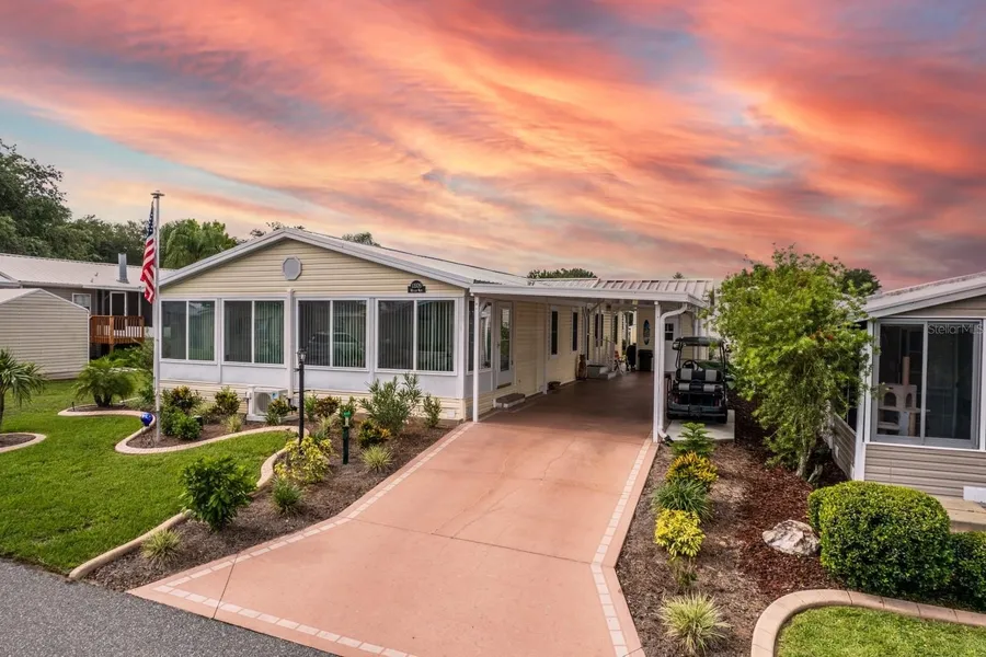 Nestled in the heart of Lake Yales premier 55+ resident-owned mobile home community, this exquisite 3 bedroom 2 bath, 1566 square-foot manufactured home offers an unparalleled lifestyle. Enjoy the elegance of a meticulously renovated residence, featuring; new windows, new doors, flooring, storm doors with screen and glass, new paint, custom closet shelving, and beautifully remodeled bathrooms with bespoke cabinet organizers. The property, surrounded by fresh landscaping, includes two versatile sheds—climate controlled eight-by-twelve under the carport and an eight-by-eight detached workshop—perfect for hobbies or storage. A pristine home including a painted driveway and a 2005 golf cart enhance convenience, while lawn maintenance is effortlessly handled by the community. Relish exclusive amenities like HOA-managed RV and boat storage, leasable boat slips, a private dock, a clubhouse, a heated pool, a soothing hot tub, a pool table, and a fire pit overlooking a serene sandy beach with direct lake access. Whether seeking a year-round sanctuary or a winter escape, this Lake County gem is close to vibrant outdoor recreation, dining, and entertainment. It beckons you to experience refined retirement living—schedule your visit today!