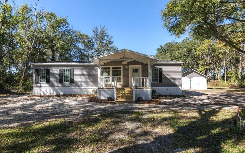Peaceful country living on this beautifully maintained property situated on 1-acre lot on a paved road. This brand new 3-bedroom, 2-bath home, all new stainless-steel appliances, tape and textured walls, has nice spacious covered porches front and back. Step inside to discover an open floor plan featuring a large living area filled with natural light, perfect for gatherings or relaxation. The primary suite provides a private retreat, complete with an en-suite bath featuring a soaking tub and separate shower. Outside, enjoy the serenity of country living with plenty of space for outdoor activities, gardening. A 20x21 workshop/shed with new roof and loft area provides ample space for storage, tools or equipment. Whether sipping coffee on the front porch or hosting barbecues in the large back porch, this property is designed for both relaxation and entertaining. Backyard boasts a neighboring view of rolling pasture and stunning oaks. Mobile home comes with a 1-year factory warranty. Conveniently located just minutes from town, this home combines the best of rural charm and modern convenience.