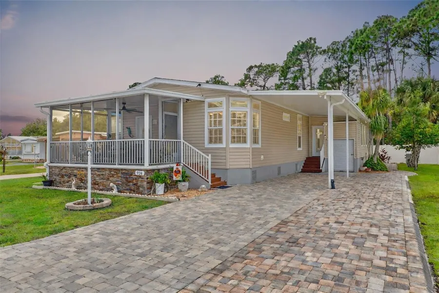 Welcome to Kove Estates.. Where do I begin with this HOME.. So many features, so little time.. This 2018 Modular Home is over 2100sq Ft Under Heat and Air, on a Concrete Base Floor with tons of undercarriage storage. Building records state it is Category 3 Hurricane safe. This 3 Bedroom 2 Bathrooms homes has so much to desire. As you walk up you're greeted by a large screened in porch perfect for morning coffee and visiting with friends. As you enter you are welcomed with a Formal living area equipped with a Coffee/Wine wet Bar perfect for entertaining guest. Tons of natural light, Large Open Family Room overlooking a beautiful kitchen with cabinets galore, Large Kitchen Island, GinAir Cooktop with Exhaust, Newer Refrigerator 2024, Laundry Room with built in pantry storage, Recess lighting and desk area. Large Primary Suite with an on suite bathroom features dual sinks, walk-in shower, walk-in closet, lots of storage. Two additional bedrooms and full secondary bathroom. Large enclosed Sunroom perfect for additional living/storage area. This house also features a Full house Central Vacuum, Crown Molding throughout, extended Paver Driveway, Back Porch with Trek Deck overlooking Large Private Estate, Water Softener, House Generator and Lots of Storage, Newly Repainted Interior 2024 Newer Washer 2024. KOVE ESTATE is a 55+ CO-OP Community Resort Style Living at its finest, enjoy all the thrills without all the fuss. There is no lot rent, as a share in the community conveys with the sale. With a monthly cooperative fee of $270 which allows you to Enjoy Year Round 9 Hole Golf Course, 2 pools, one heated, tennis courts, pickle-ball, community events and the peaceful nights all in your very own gated community. Located just outside of Historical Sanford Fl. Sanford Airport is minutes away, Daytona Beach 40 minutes, Disney 45 Minutes away. The perfect spot to call home.