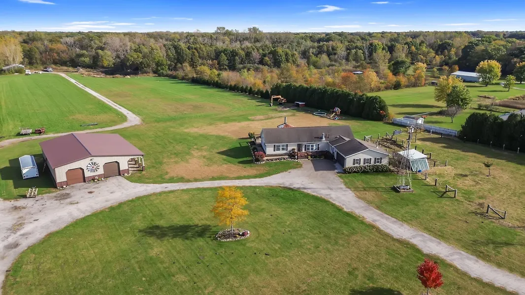 Welcome to the country! Bring the horses and the animals- you'll have plenty of room on this 10 acre mini farm! This 3 bedroom, 2 bath, 2000+ sqft manufactured home is on 10 acres!! The sprawling layout is loaded with awesome hardwood flooring, solid six panel oak doors and custom ceramic tile. The rec room has a floor to ceiling stone fireplace and beautiful hardwood flooring. The open concept living room & kitchen area is all hardwood & tile and is loaded with windows for great views of your acreage! The kitchen boasts a pantry, butcher block island and glass doors leading to the 2 tiered rear deck. The primary bedroom is home to a walk in closet and 3/4 bath while bedrooms 2 & 3 share a full bath. Just past the enormous laundry/mudroom and the breezeway is the 24x30 oversized attached garage. Outback you'll find a custom grain bin pergola with a firepit for hanging out with friends on those cool autumn nights! The 3000+ sqft pole barn is a clean slate, currently used a scold storage- there are endless possibilities for your future stalls, tack room or auto shop.... you can choose! There is also a small barn with a fenced in pen for more critters. In the back of the pasture is a nice sized open front shed for hay storage and there is also a start of a pond! All of this is located close to 49 for an easy commute.