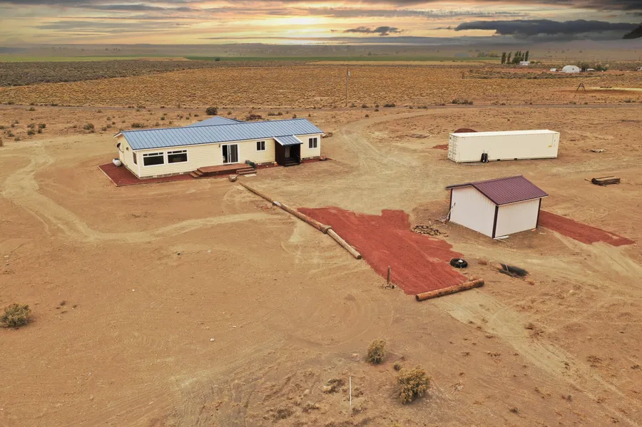 Enjoy the Sunrise and Sunsets from this beautiful home perched on an elevated private and peaceful spot overlooking the valley and mountain ranges. Incredibly clean and well maintained home with some nice upgrades such as a metal roof, marmoleum tile flooring throughout the kitchen, laundry and dining area, new exterior paint, solid core fir interior doors, ceiling fans, propane fireplace for additional heat, jetted tub and upgraded carpet. There's also a full concrete slab underneath for clean easy access. About 20 acres of cleared land with underground sprinkler system already installed and RV parking that has full hookups. Close to BLM and Sand Dunes. This property is turn-key and ready to go, set up your viewing appointment before it's gone!