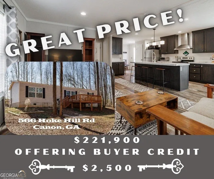Sellers Offering $$$ for Closing Cost Assistance or Rate Buy Down with Reasonable Offer. Charming Country Retreat in Canon, Georgia - Welcome to 566 Hoke Hill Rd, a peaceful and picturesque property nestled in the heart of Canon, Georgia. This lovely modular home, built in 2023, is tucked back from the road, offering the perfect blend of rural tranquility and modern comfort, with plenty of space to enjoy both indoors and out. The home is set on a block foundation with a stucco finish and is built to FHA standards-making it eligible for FHA, Conventional, and possibly USDA or VA financing. No HOA, all appliances included, excellent investment potential. With 3 bedrooms and 2 bathrooms, this cozy home has an open floor plan, plenty of space for gathering and large windows that fill the home with natural light. The bright and airy living room greets you with its charm and warmth, offering b...