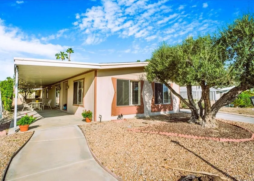 Checks All The Boxes! :55+Gated Golf Course Community-Great Price!-Move-in-Ready!:Low HOA Fee!-Walk to Remodeled Clubhouse!-Pickleball,Bocce,Pub,Cards,& 3 pools! This lovely 2Br,family room home is light & welcoming with a great Cul-de-sac location near the Clubhouse in Portola Country Club where you own your land. Enjoy the new 4-ton Central Air Conditioner & furnace that cools like a dream and is quiet as well. The living-room & formal dining area have plantation shutters. The kitchen has a built-in dining island looking toward the family room & outdoor patio area. Nice white gas appliances, double sink & light oak laminate flooring for easy care. The family room has a wet bar, track lighting & built in bookshelves. The extra large office/laundry room has plenty of storage & built in desk for your computer & printer. The primary BR features an ensuite bath with separate shower & soaking tub & vanity with dual sinks. The guest bath adjacent to the guestroom has a vinyl shower with built-in seating. Dine ''Alfresco'' in your covered patio enclosed with slumpstone wall & Fiscus trees for privacy. The area can also be a perfect play area for your canine pal with the addition of a gate. The entire home is enclosed on three sides with nice slumpstone and there is parking for two cars & a golf cart under the covered carport that has entry access direct into the kitchen. A large storage shed gives you room for your bikes, garden tools, etc. Portola Country Club has only 500 homes ranging from the mid-200's to $500,000. Come take a look at this great opportunity to live in such an exceptional 55+community in Palm Desert.