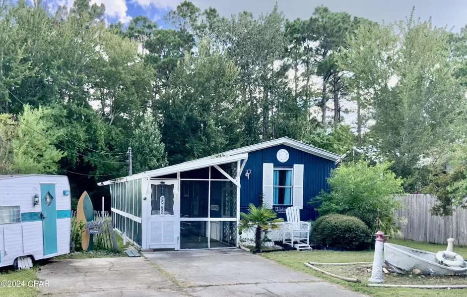 A RARE FIND in FL... NO HOA! N0 LOT RENT! Own your lot! In PCB .... also in the county. Chickens permitted! A small brook and wooded area run across the back of the lot. Also has a small out-building. A screened porch runs the length of the home in front. There is a ramp at the back door. Make this your quiet beach retreat, or your home. It is clean, quiet, and move-in ready!