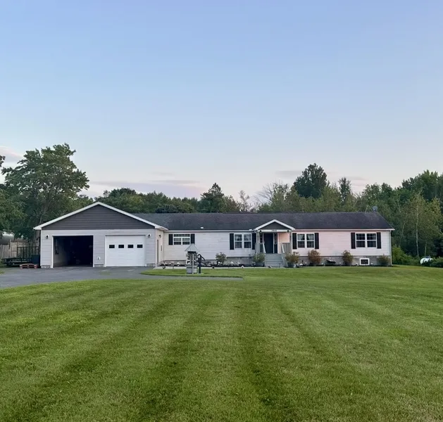 2000 double-wide home with 3 bedrooms and 2 updated bathrooms situated on 1.4 acres. The home is set on a poured concrete foundation with a full basement. A detached two-bay garage is located on the property with an additional rear bay suitable for an ATV, lawn equipment, or smaller vehicle. Interior layout features an open-concept kitchen with adjoining dining area and two separate living rooms, one with a fireplace. The primary suite includes a large bedroom with French doors leading to a full bathroom that has been updated with ceramic tile, dual vanities, soaking tub, and separate shower. The second bathroom has also been updated and features hardwood flooring. The basement provides additional storage and utility space, as well as a wood stove for supplemental heating. Mechanical systems include propane central air and a recently installed 22kW Generac generator as well as on demand hot water. Exterior features include a rear deck with access to the backyard and 1.4 acres of land. Home is located 25 minutes to Plattsburgh.