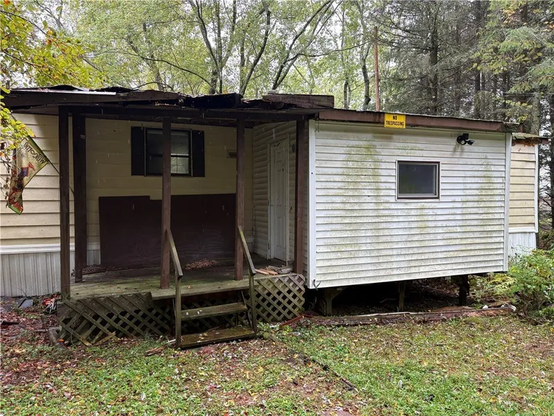 A true fixer upper being sold as is where is NO REPAIRS will be done. It needs a roof right away it is leaking and there is what appears to be mold inside the home. Decks and porch need repair. sits on blocks and has no tie downs. The well pump was pulled and never replaced. Very nice land to put up a new house. one and 1/2 baths NOTE! School district is Gilbertsville Mt. Upton
