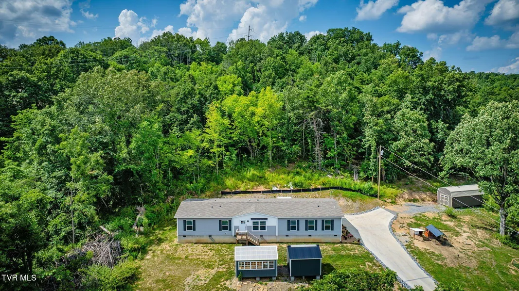 PRICED BELOW MOST RECENT TAX APPRAISAL! Motivated Seller! This 2023 doublewide home sits atop 4.1 acres in the hills of Johnson City, by the Tweetsie Trail in the back of a cul-de-sac. Offering 5 Bedrooms, 3 Bathrooms, 2 Living Spaces, and THREE Outbuildings (a greenhouse, a yard barn, and a spacious outbuilding with electricity), this home is truly one of a kind and a must see! This home offers an open floor plan filled with bright, airy living spaces. The kitchen features a large center island, abundant cabinetry, and plenty of workspace-ideal for cooking, entertaining, and everyday living. The primary suite is a true retreat, offering a spa-inspired bathroom with double sinks, a luxurious soaking tub, and a modern glass-enclosed shower. The modern, open-concept living room features built-in bookcases, adding custom charm and the perfect spot for books, decor, or family keepsakes. You'll also love the convenience of a dedicated laundry/utility room with extra space for storage. This home also includes a whole-house ventilation system, helping to keep the air fresh, clean, and comfortable throughout the year. Set on 4.1 private acres, this unique property is located on a hillside, offering a peaceful, elevated setting with room to garden, explore, and grow. No HOA means you can fully enjoy your land without added restrictions. For those dreaming of a private, more self-sufficient lifestyle, this property is truly a homesteader's dream. It features three versatile outbuildings: -A 10'x16' greenhouse, perfect for year-round gardening -A 10'x12' powered shed, ideal for a workshop, creative space, or she-shed -A spacious 12'x24' yard barn with ample storage Located in a quiet, established neighborhood in Johnson City and minutes to Elizabethton, this home offers the rare opportunity to embrace ''Homesteading on the Hill in Stoneybrook''-where privacy, space, and potential come together. Don't miss your chance to own this move-in ready property!