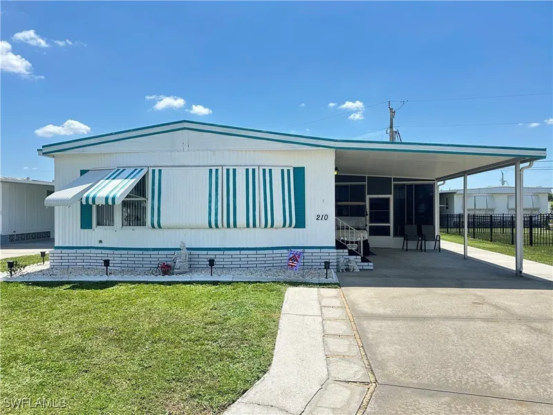 Beautiful 2 BR/2 BA Manufactured Home located in Carriage Village. This 1400 sf home built in 1980 is being sold turnkey. New beautiful luxury plank flooring in Kitchen, Dining Room, Living Room & Owner's Suite. Owner's suite is very spacious with lots of closet space. Florida Room with sliding acrylic windows done in 2017 with access for golf cart parking. Large Utility Shed with Washer, Dryer, Laundry Tub & Storage Area. AC is 2022. New Refrigerator. Home has been replumbed. Awnings around home for added weather protection and sun. OWN YOUR LAND in this 55+ active, pet friendly community with maintenance fee only $95/month. Carriage Village has a large, heated pool, clubhouse, hobby shop, library, billiards room, shuffleboard, bocce ball, ceramics, dances and more. Start enjoying the Florida Lifestyle.