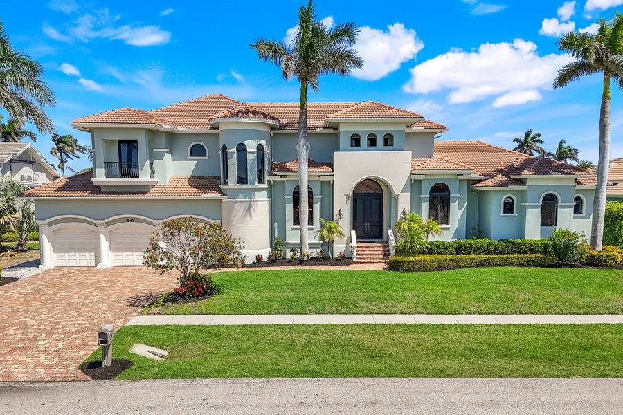 Near the Gulf, this five-bedroom-plus-den palatial waterfront estate with long-water views has recently been beautifully updated with fresh paint inside and out, new roof in 2018, new oversize custom dock with a 24,000-pound boat lift and 7,500-pound platform lift in 2023, and a new panoramic screen enclosure in 2023. Six full baths, dual laundry rooms plus a large loft area make this house perfect for a large family or entertaining guests. A massive oversized three-car garage with room for lifts complements the grand scale and vastness of this custom masterpiece. The grand entrance features a two-story foyer and welcomes you to an open plan formal living room and dining area. A full-service wet bar with wine cooler opens to the family room for entertaining. The large dine-in kitchen with center island, breakfast bar, walk-in pantry and storage is perfect for entertaining. The stylish tile flooring, fixtures, finishes and high ceilings add to the luxury villa vibe, while large impact windows and sliders bring in abundant light. A custom waterfront in-ground heated pool and spa, lounging area and multiple dining areas provide great canal and long-water views.